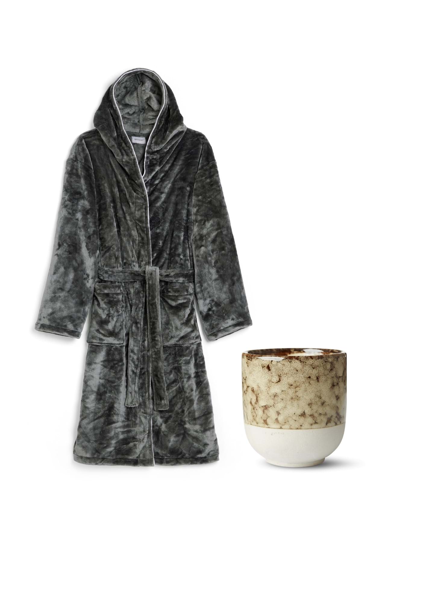 I detta set ingår morgonrocken Matin i grå flanellfleece och doftljuset Chiara. Morgonrocken har en lyxig, mjuk kvalitet och en omslutande luva. Chiara doftljus kommer i en vacker keramisk behållare. Doften ”Sacred Forest” fyller ditt hem med en lyxig doft av cederträ. Brinntid 20-30 h.