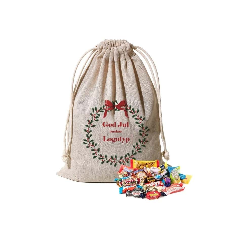 Tillverkad av ett hållbart, naturligt och ekologiskt material som blir till en tidlös produkt med skandinavisk känsla. En bestående säck med omtanke om både människa och miljö. Fylls med favoritmix! Säckarna kan tryckas med din logotyp eller din helt egna design (väljer man ingen design eller logotyp levereras säckarna tryckta med God Jul). Möjligheten finns att trycka en egen logo och/eller budskap på ett gediget träkort eller klassiskt julkort.