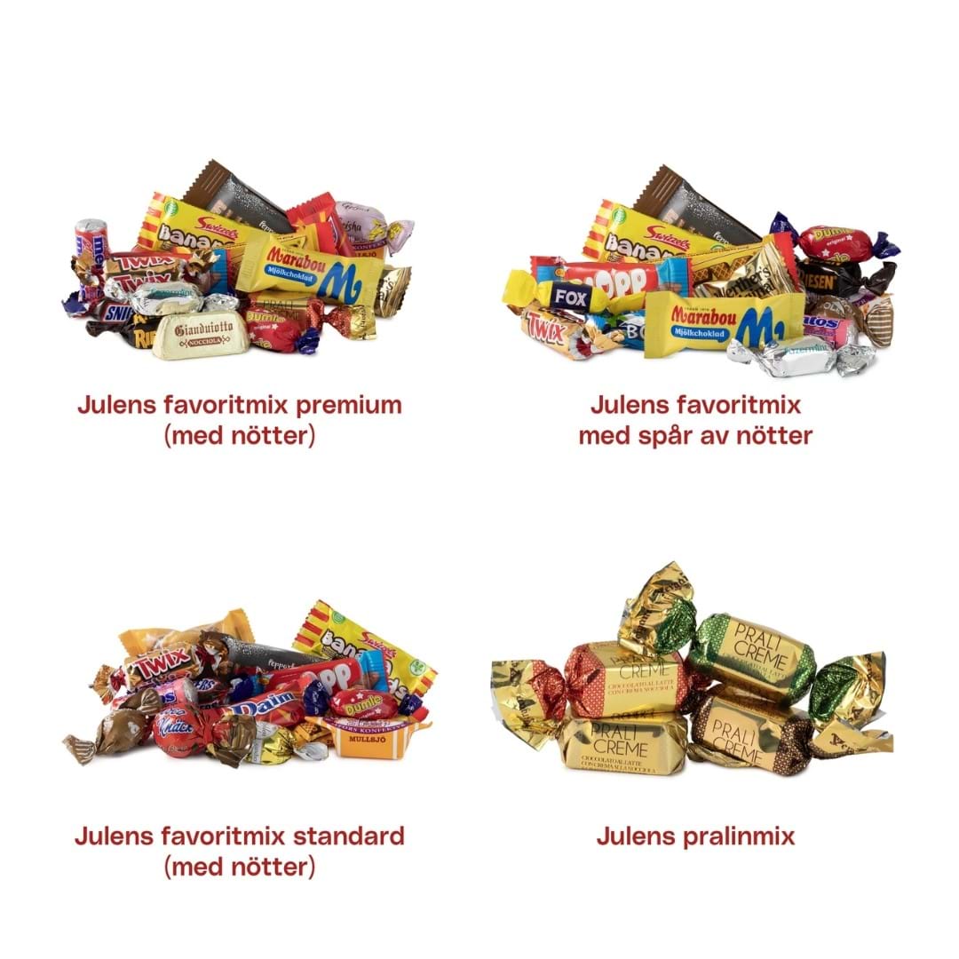 Favoritmix med spår av nötter är en härlig julblandning utan nötter i innehållet, men kan innehålla spår av. Fylld med välkända varumärkesgodisar som sprider både smakglädje och julstämning till fikabordet, klappen eller eventet.