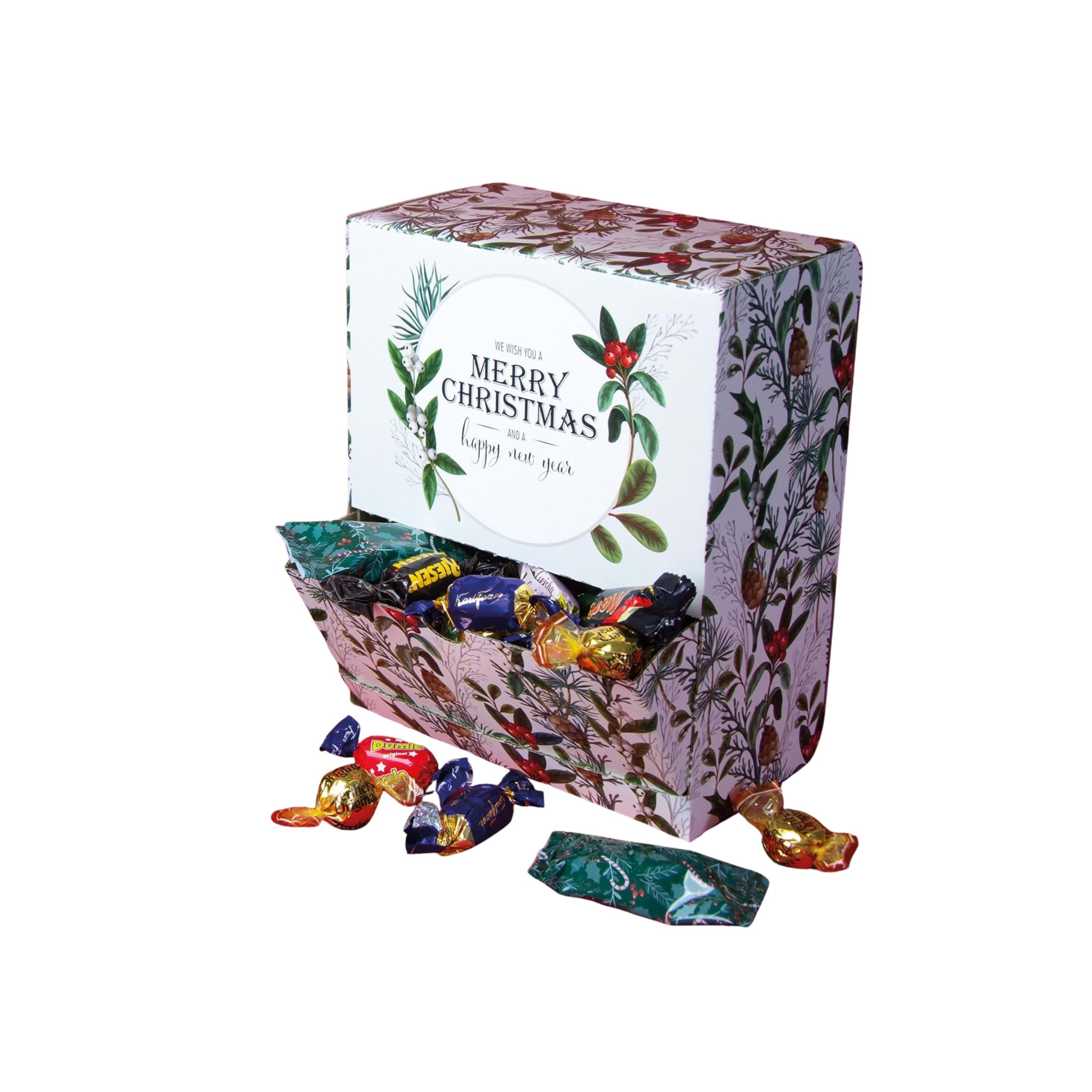 Vår pappautomat med ett juligt motiv fylld med gott inslaget varumärkesgodis.