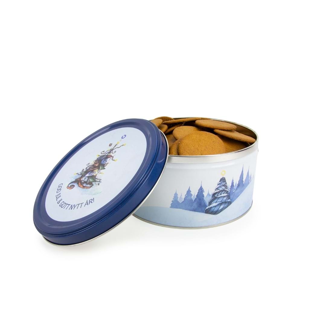 Plåtburken fylld med härliga pepparkakor. En bra julgåva att ge bort till, medarbetare, anställda och kunder. För burkar med banderoll och etikett ingår standardtryck (4-färg, CMYK) med er logotyp och något av våra julteman (Minimum 25 st) För helt egendesignad banderoll och etikett tillkommer det en kliché på 600 kr/design.