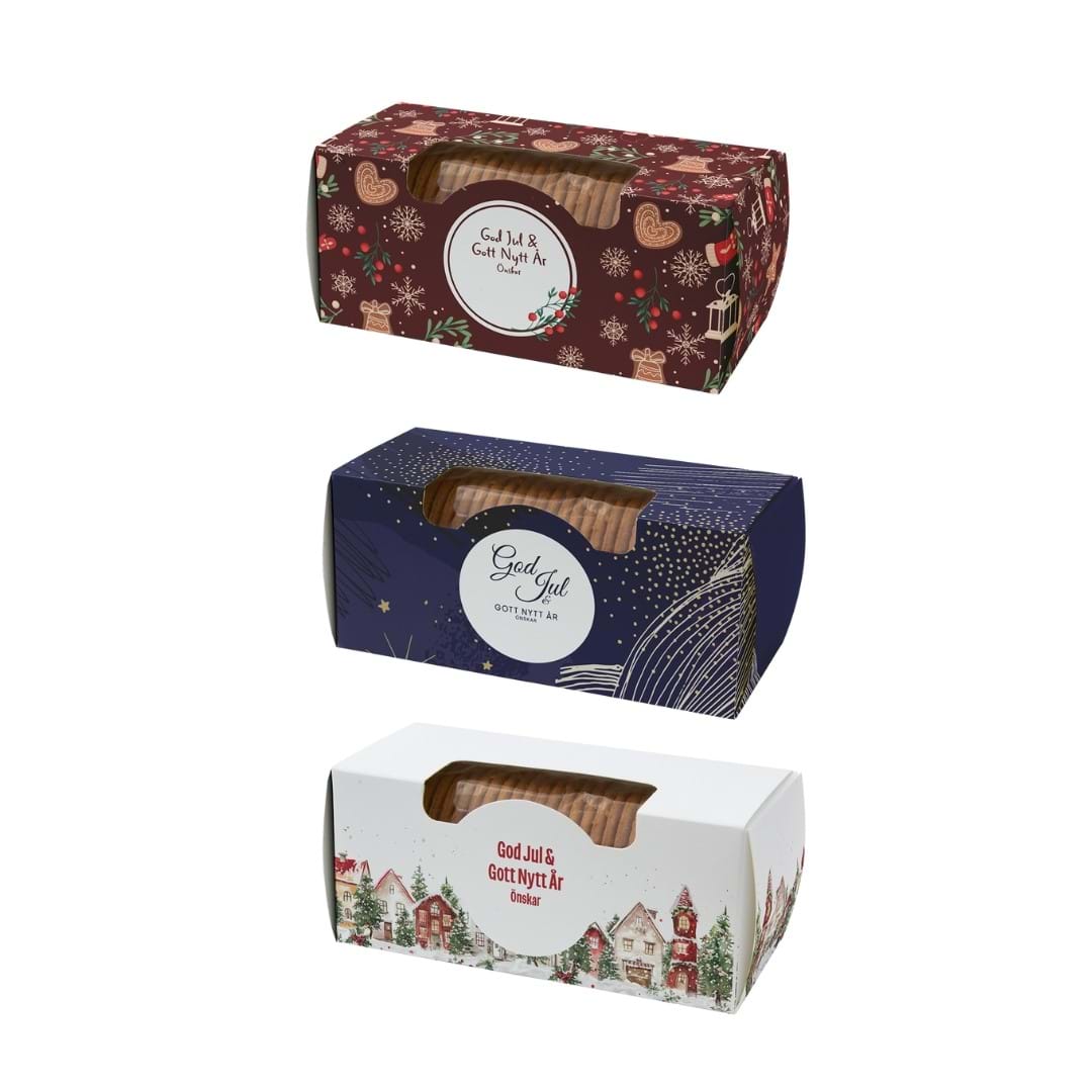 Ekologiska pepparkakor i en charmig liten pappask med fönster. Kan tryckas med färdigt jultema och er logotyp, eller med helt egen design.