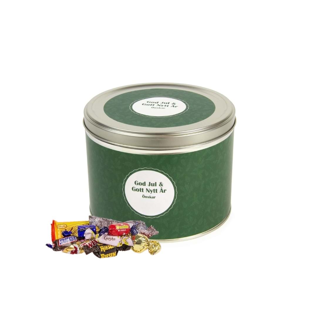 En högre variant av Plåtburken med inslaget varumärkesgodis. En bra julgåva att ge bort till, medarbetare, anställda och kunder. För burkar med banderoll och etikett ingår standardtryck (4-färg, CMYK) med er logotyp och något av våra julteman (Minimum 25 st) För helt egendesignad banderoll och etikett tillkommer det en kliché på 1000 kr/design.