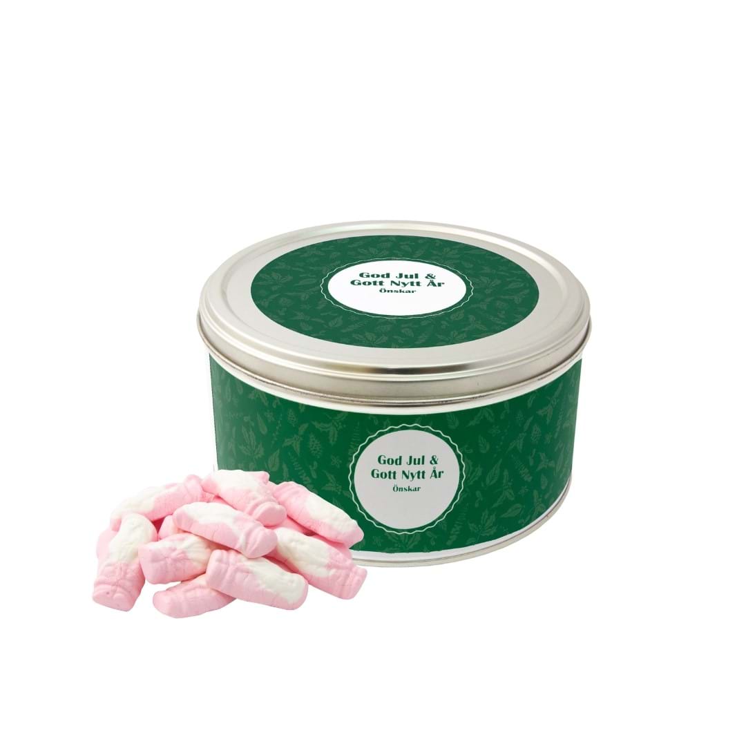 Vad vore julen utan Cloettas klassiska skumtomtar? Med denna plåtburk får ni en rolig julgåva med en tydlig avsändare och ett riktigt gott innehåll. För burkar med banderoll och etikett ingår standardtryck (4-färg, CMYK) med kunds logotyp och något av våra julteman (Minimum 25 st) För helt egendesignad banderoll och etikett tillkommer det en kliché på 1000 kr/design.