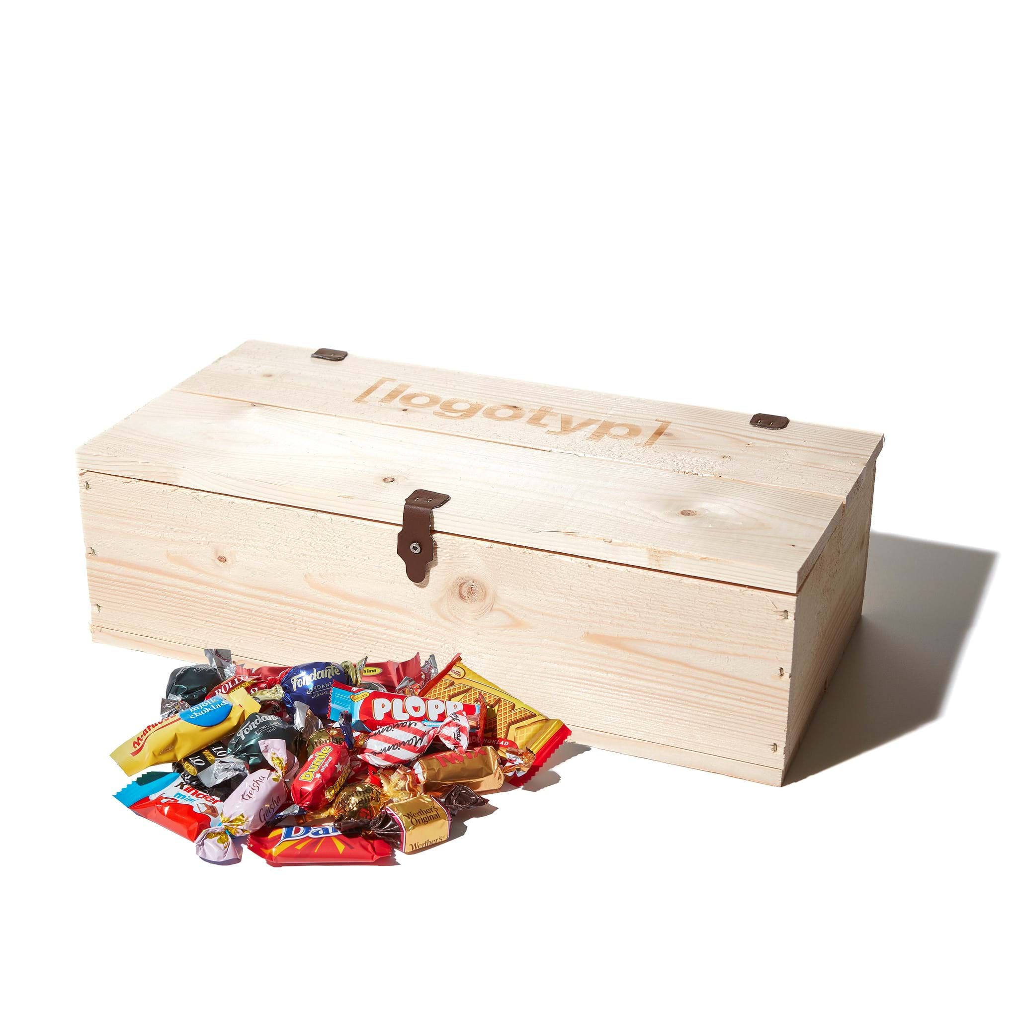 Rustika och stabila trälådor med beslag av konstgjort läder är en gedigen presentförpackning som julgåva. Trälådorna är fyllda med godis av högsta kvalité och kan brännas för ett juligare intryck. Önskar ni lådan utan gravyr går det givetvis bra att addera ett julkort med en personlig hälsning.
