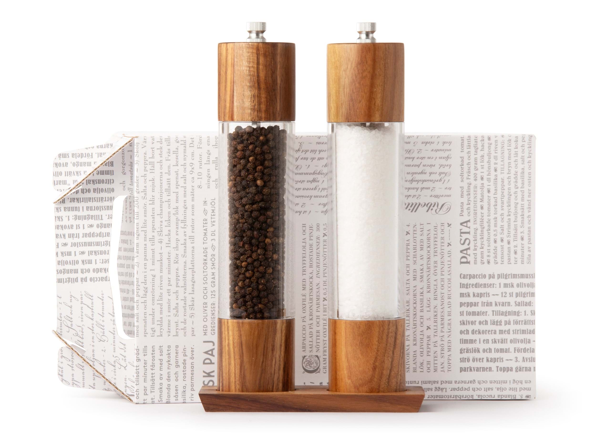 Två exklusiva kvarnar, 24 cm, i acaciaträ med Himalayasalt och svartpeppar, komplett med matchande bricka.