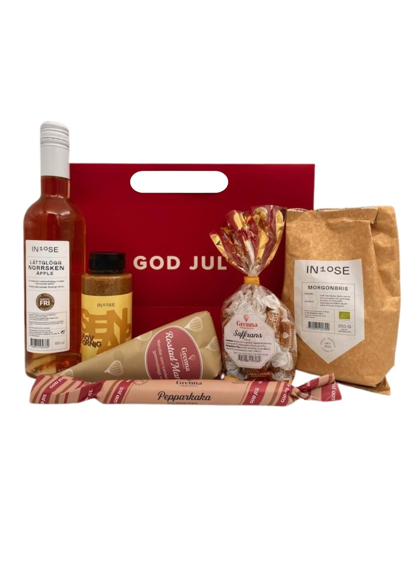 En stor och stämningsfull röd julpåse med vitt sidenband, fylld med smak av tradition och omtanke. I påsen gömmer sig en värmande äppleglögg, en grovkornig senap som lyfter julskinkan, knapriga rostade mandlar från Småland och mjuka saffranskolor. Här finns också ett fylligt malet kaffe från ett småländskt rosteri, perfekt till julfikat, samt en klassisk polkagris med pepparkakssmak.