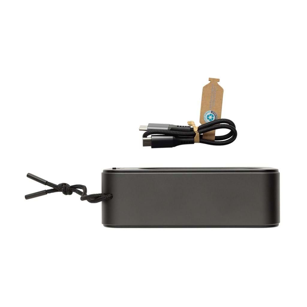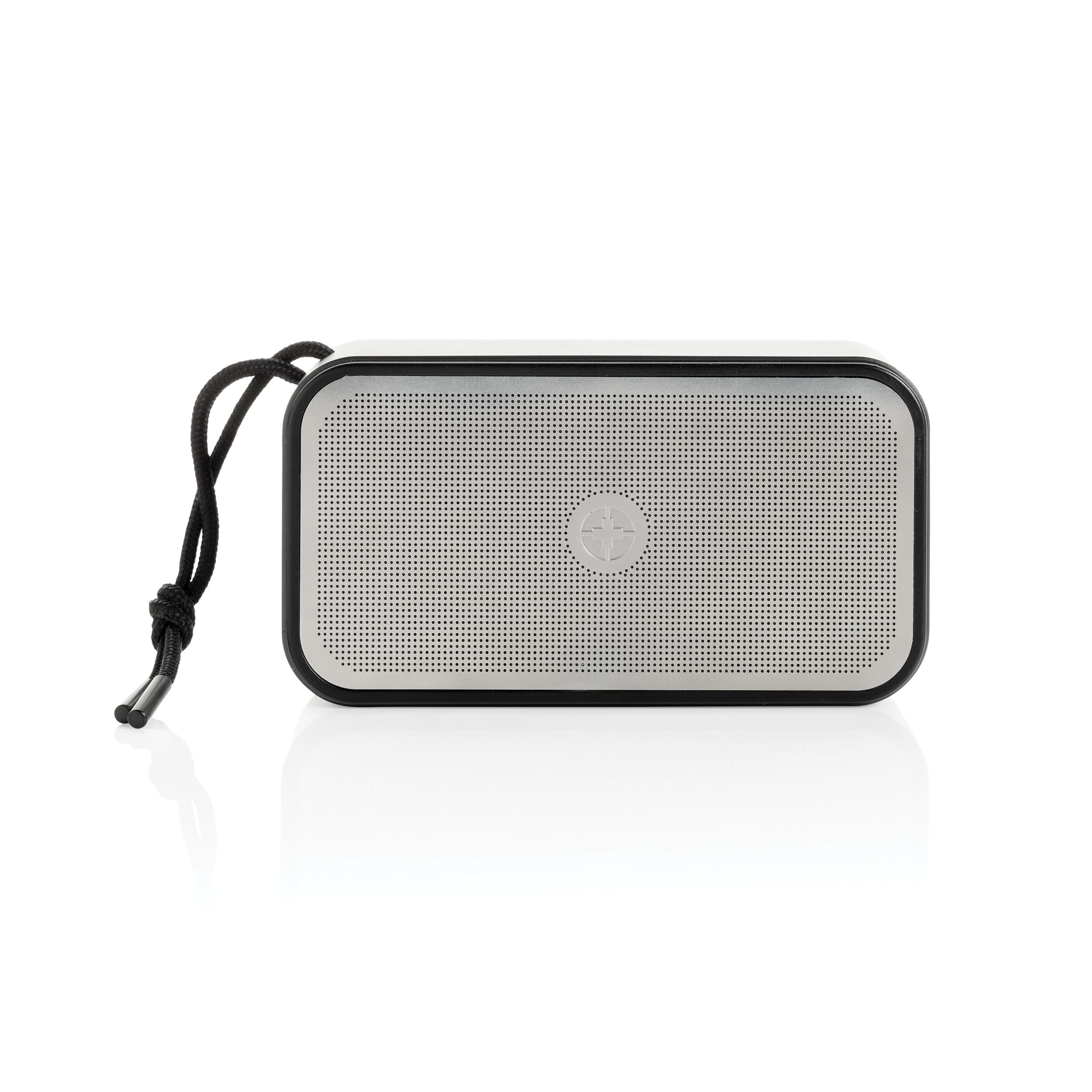 Kraftfull högtalare som levererar djup, resonant bas tack vare integrerad subwoofer och dubbla 10W-högtalare. BT 5.3 för sömlös anslutning och automatisk parkoppling. 1200 mAh polymer Li-ion batteri ger upp till 5 timmars speltid på 50% volym. USB-C- och AUX-anslutning. PVC-fri med bärrem av RPET.