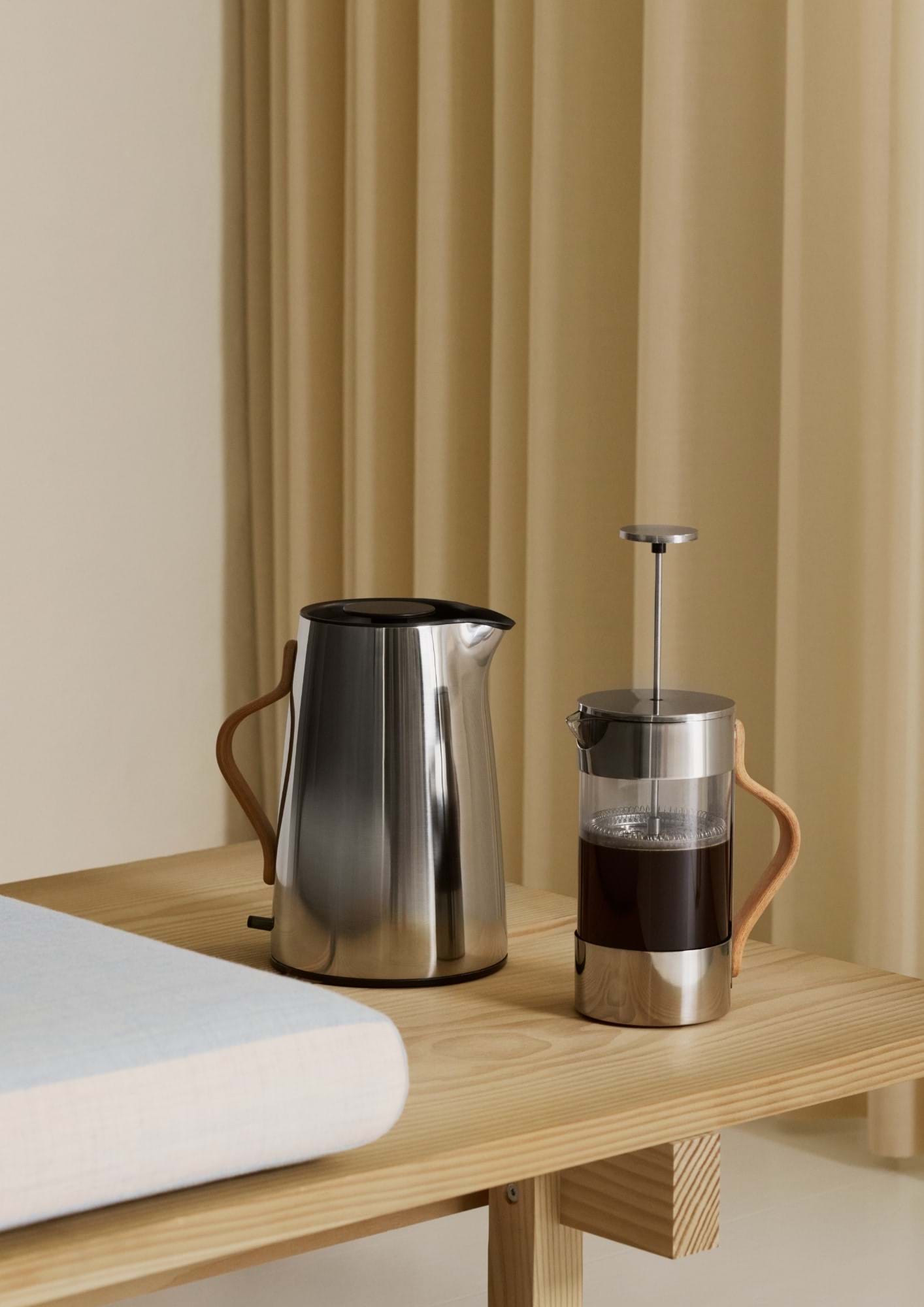 Elegant kaffepress i lackerat stål och handtag i vackert bokträ från Steltons ikoniska Emma-serie. Miljövänligt alternativ utan engångsfilter eller plastkapslar. En present för kaffälskaren som uppskattar både hållbarhet och oöverträffad smak.